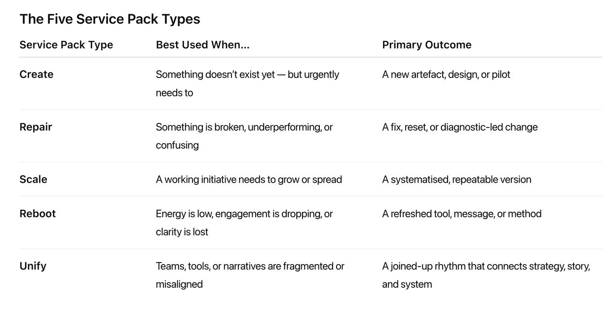 Each Pack is tailored to a specific business need. Whether something needs to be created, fixed, scaled, or refreshed, Service Packs provide a structured and fast-moving way to engage with our team — without the overhead of a long consulting cycle.
